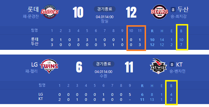 두산롯데 경기와     케티엘지 경기는  둘다 15점 이상의 대량득점이 발생한 경기지만.....