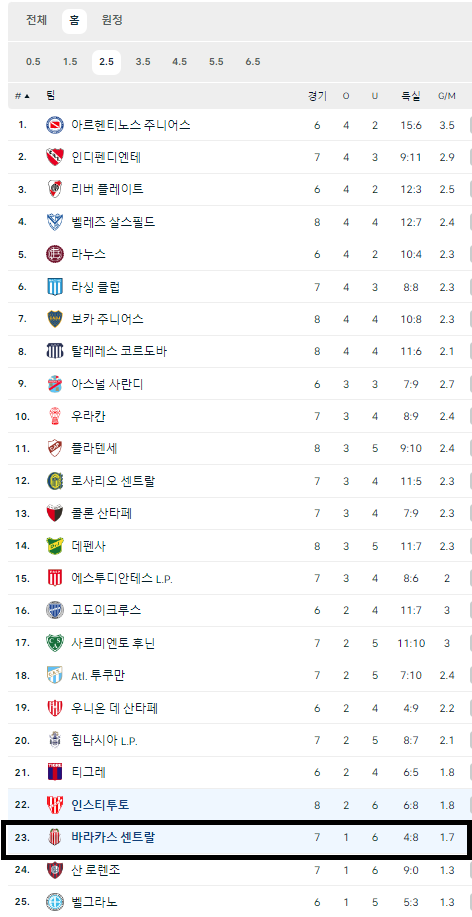 아르헨티나   홈팀 바라카스     홈 기준점 2.5에서의 언오버