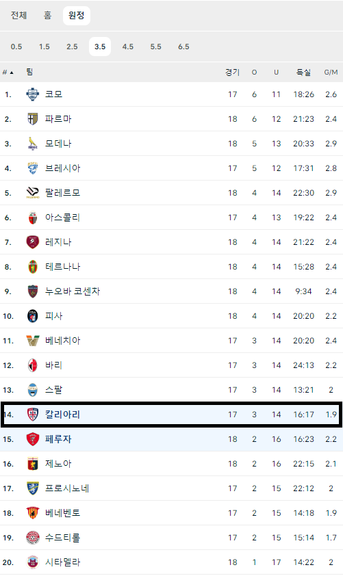 칼리아리의 원정 기준점 2.5에서의 언오버