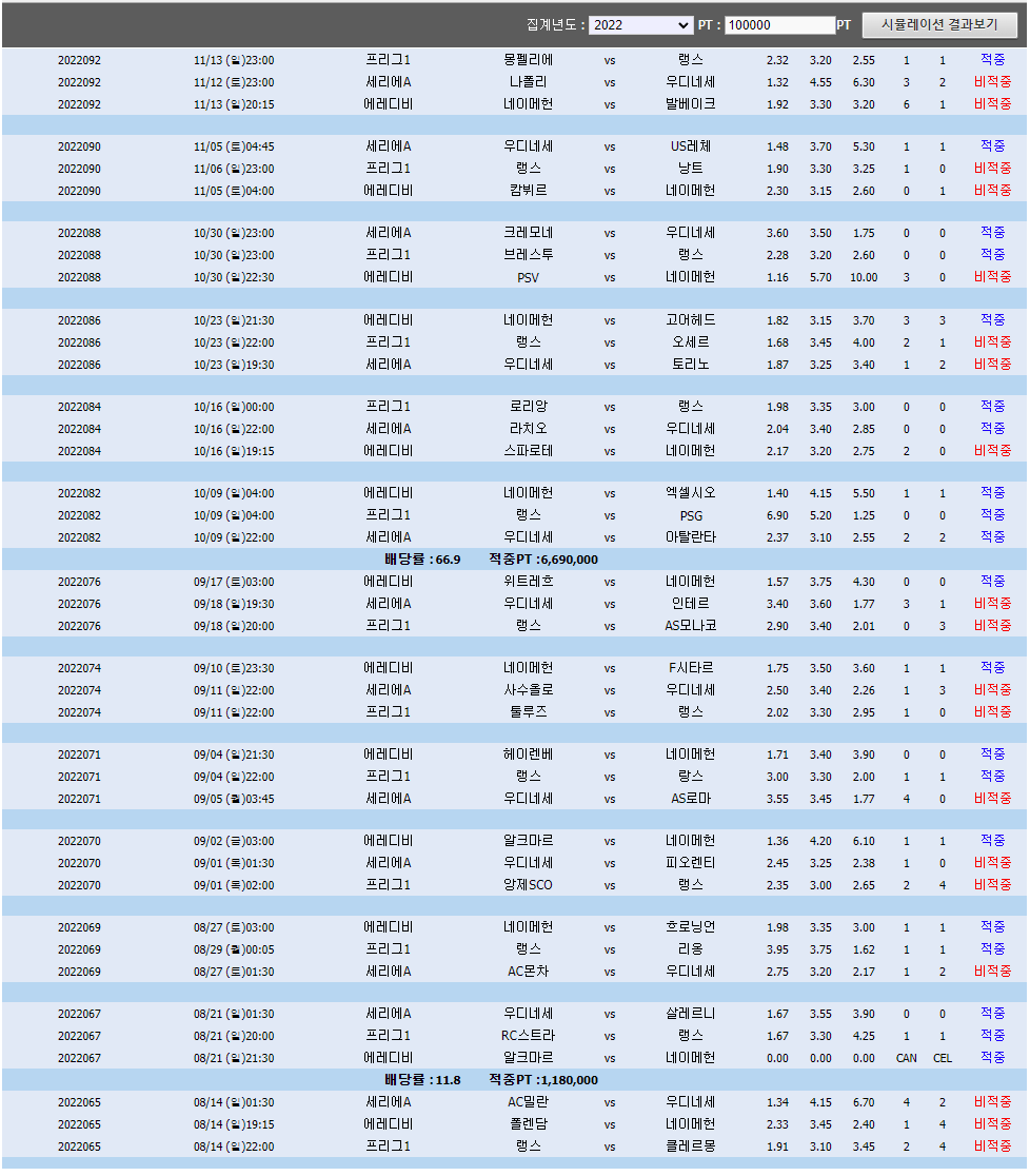 위에는 22년도  8월 개막부터  12월 연말까지의 13번의 배팅 결과이고