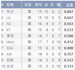 화요일 총 15경기에서 13승 2패를 기록한 두산