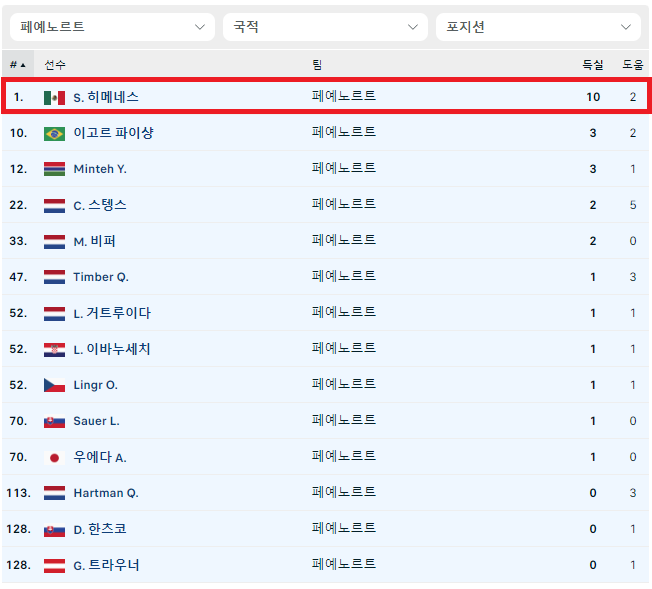 현재 폐예노르트의 득점분포를 살펴보면 ...