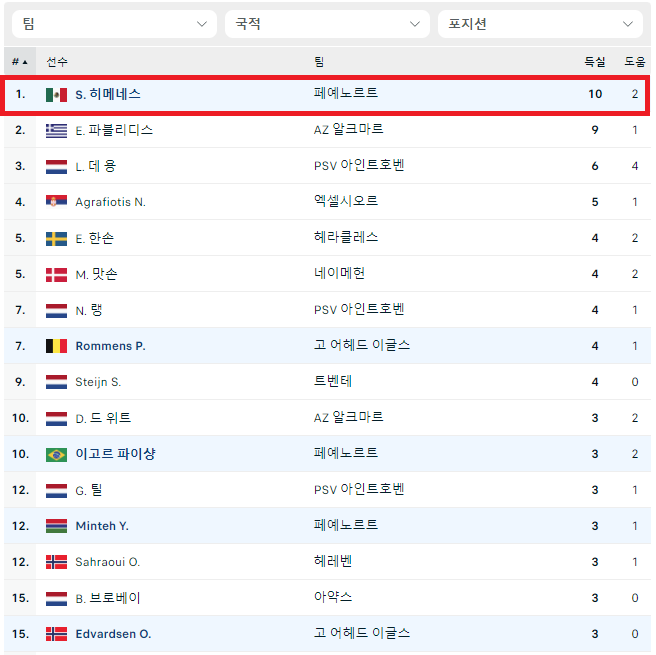 그래서  현재   7경기가 끝난시점에서  10골 으로    에레디비시   득점1위를 달리고 있습니다