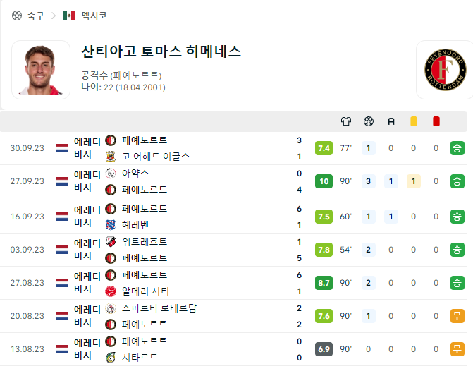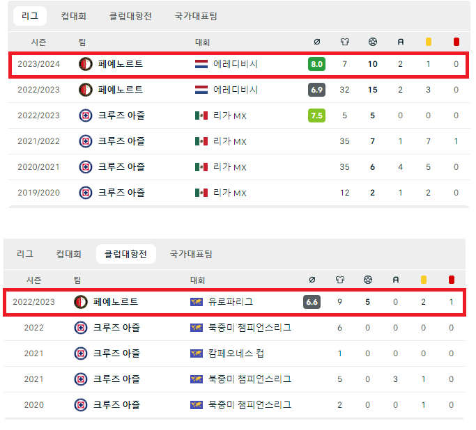 저번시즌은 폐에노르트가  챔스가 아닌 유로파 였는데    여기서 9경기 5골을 기록하져