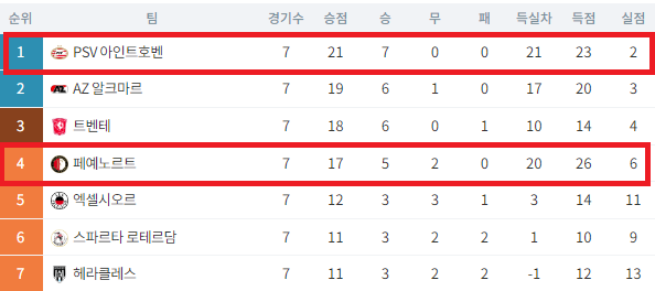 왜냐면  현재  네덜란드 리그 에레디비시는  7라운드가 끝났는데