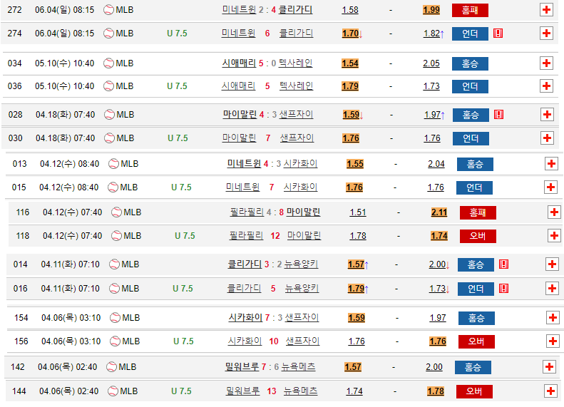 MLB 에서   홈팀 배당이   1.5대 를 형성하고  + 7.5기준점 에서   언더배당이  1.7대를 유지할때