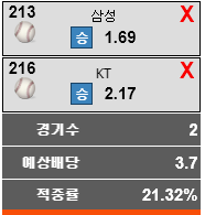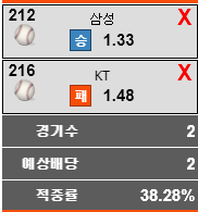 오늘 국야에서  삼성과 케티의 배당은 2배인데 조합가능성은 38% 밖에 안되져