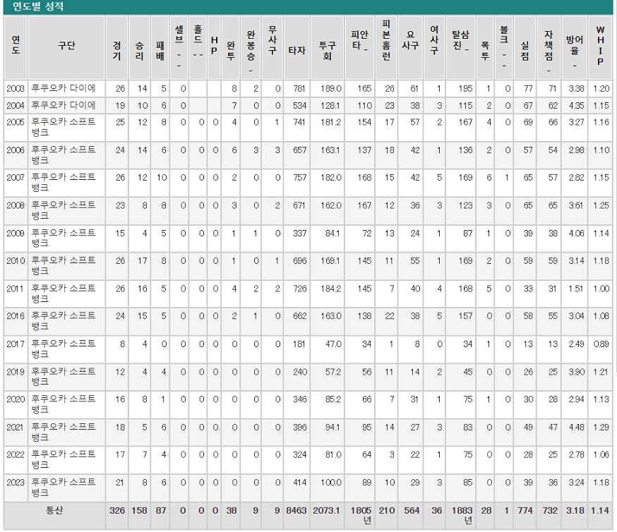소뱅의 투수 와다는   81년생 입니다.  2003년부터 선수생활을 했네요.