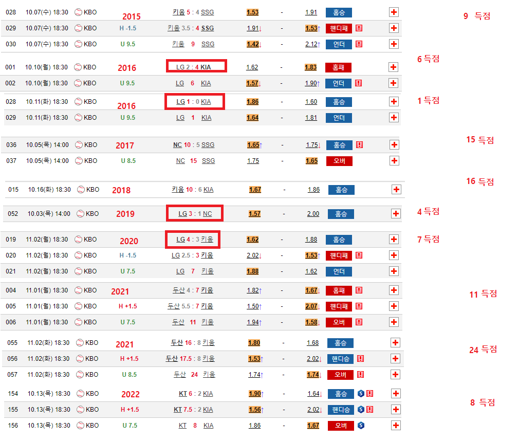 2016년 와일드카드    엘지 대 기아     2대4  ,  1대0        6점 , 1점