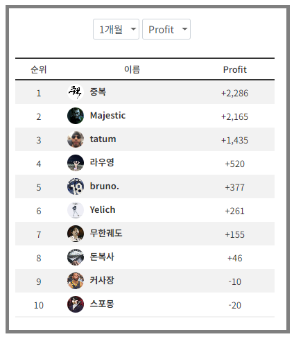 | 순위 | 이름 | 프로핏 | ROI | PICK |