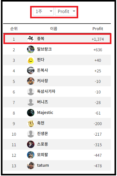 | 순위 | 이름 | 프로핏 | ROI | PICK |