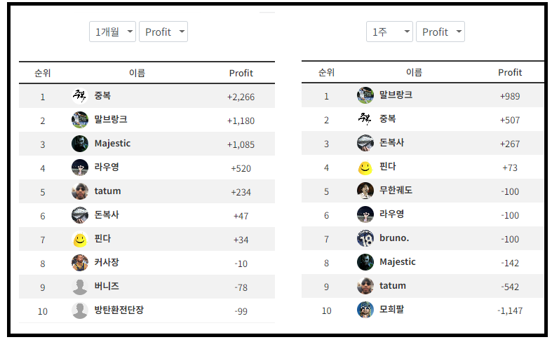 | 순위 | 이름 | 프로핏 | ROI | PICK |
