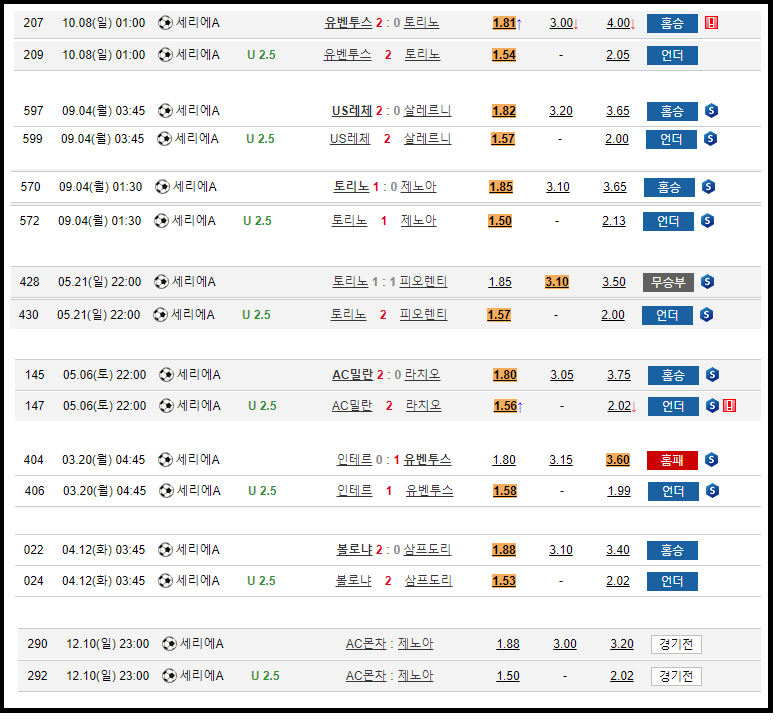 세리아에서 홈 1.8대를 받은팀이  언더배당이 1.5대를 받았을때