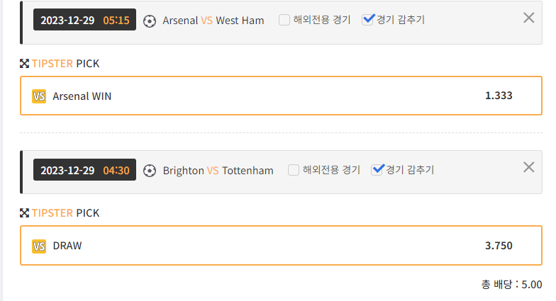 이거말고는 좋아보입니다.   아스널 승  & 토트넘 무